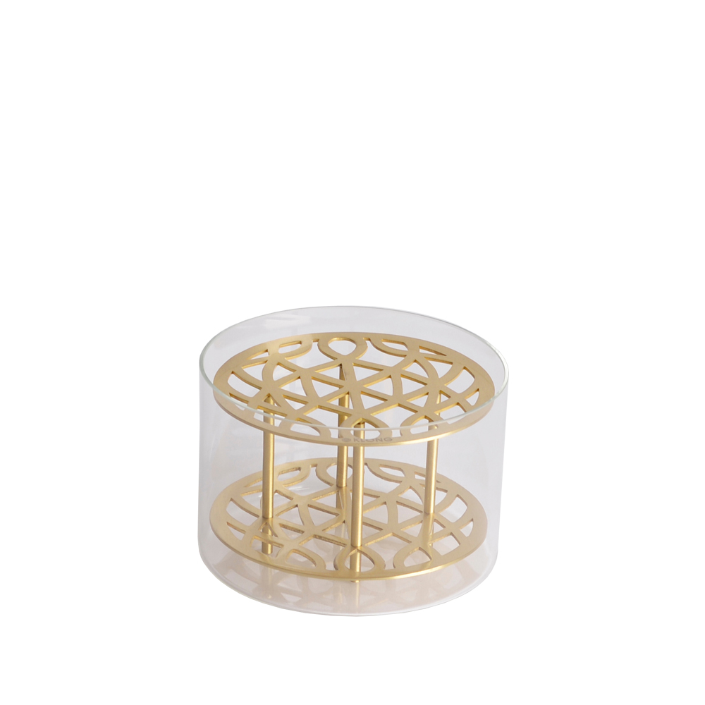 Äng, vas i mässing och glas från Klong, formgiven av Eva Schildt. Den sirligt utskurna mässingen fungerar som blomsterstöd. Placera ut blommorna efter eget tycke och smak och skapa din egen sommaräng.