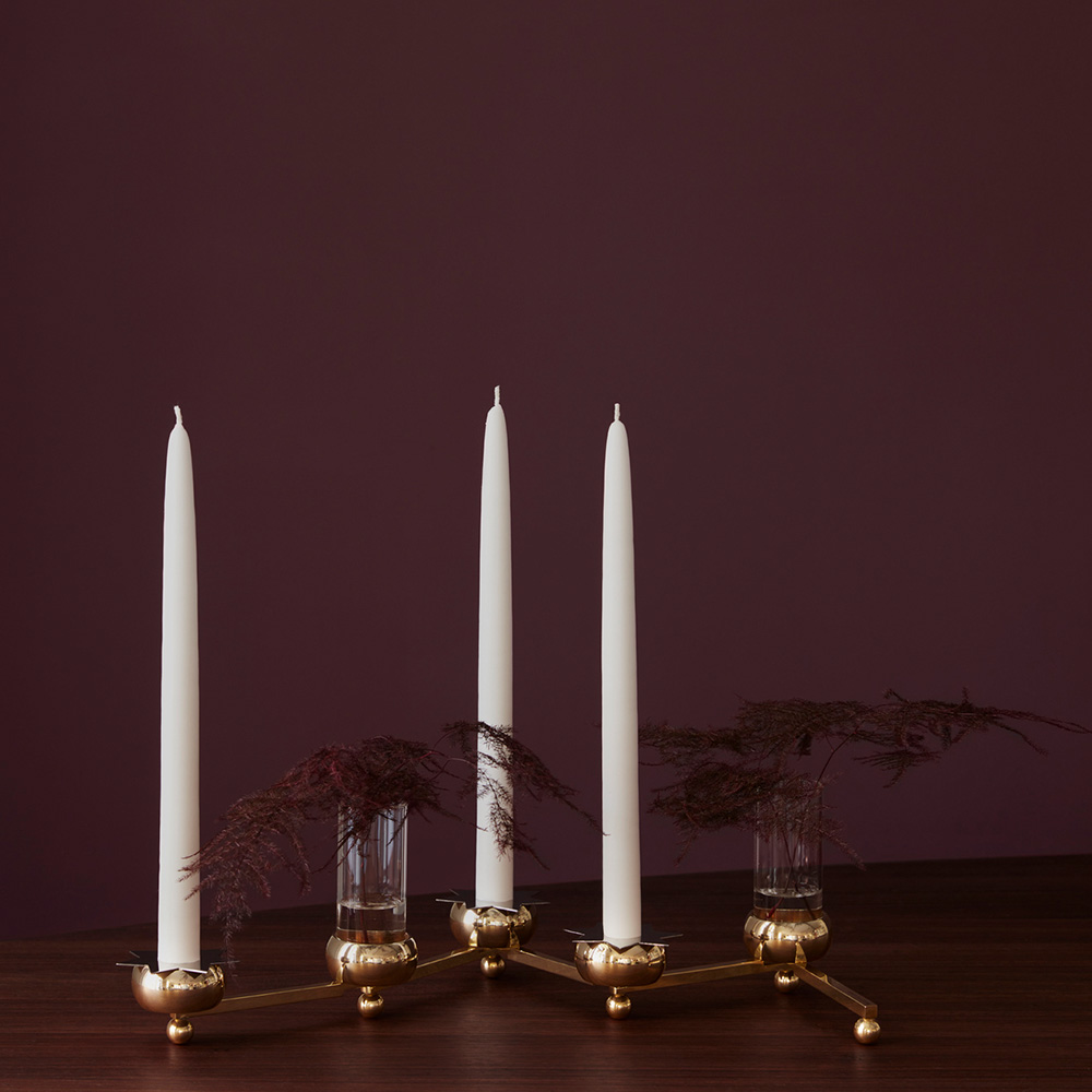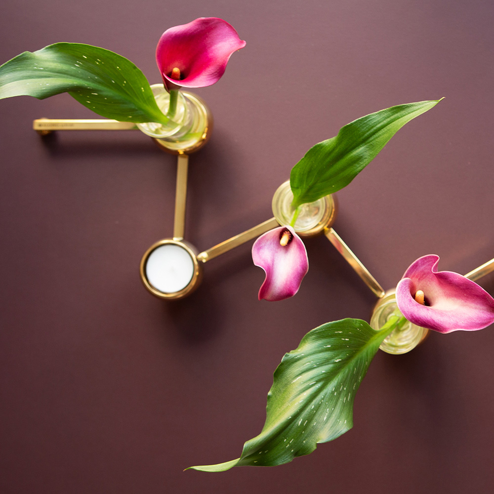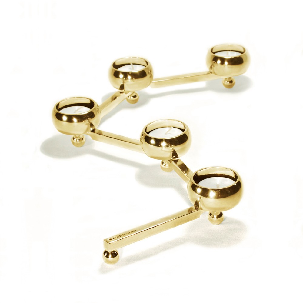 Constella ljusstake small mässing från Klong. Idén bakom Constella var enligt formgivare Eva Schildt att skapa en låg ljusstake för värmeljus med flexibel form som kan anpassas efter dukningen. Constella lever verkligen upp till den ansatsen med sin smarta zick-zack konstruktion som låter den slingra sig likt en orm mellan fat och glas! Constella finns i två olika storlekar samt i två utföranden. Det finns även insatser som kan köpas till för vas eller kronljus vilket möjliggör att du kan skapa din egen kombination efter önskemål.