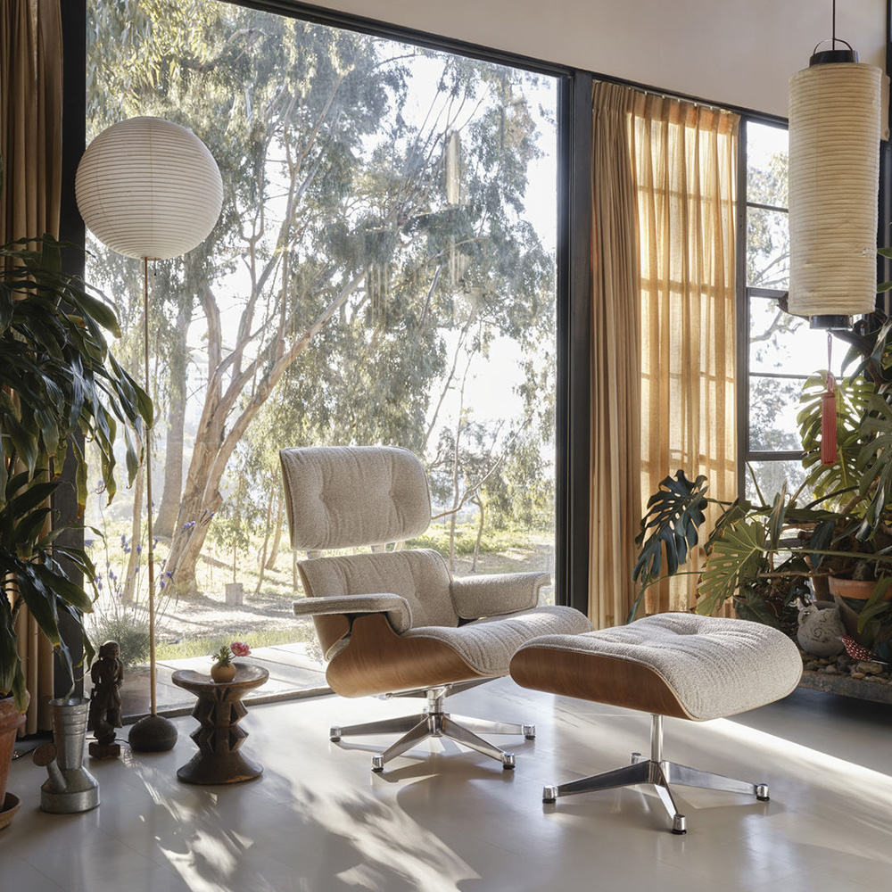Charles and Ray Eames Lounge Chair & Ottoman fabric från Vitra är den ikoniska designklassikern som kombinerar stil och komfort på ett unikt sätt. Denna designikon erbjuder tidlös elegans och är en eftertraktad sittmöbel. Den här versionen i tyg är en nyhet och klädd i ett mjukt och vackert bouclé tyg.