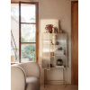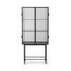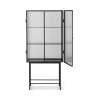 Motsatser lockar på detta skåp, tillverkat av elegant pulverlackerad metall och korrugerat glas. Glasdörrarna stängs sömlöst tack vare magneter och öppnas för att avslöja två pulverlackerade metallhyllor. Använd i badrummet för att elegant förvara skönhetssaker eller som en modern kontaktpunkt i din matsal för att förvara serviser och mer.