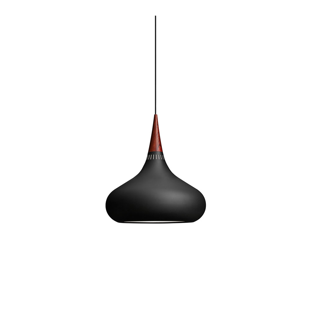 Design: Jo Hammerborg 1963 Mått: Ø: 50 Höjd: 54 cm Material: Svart mattlackerad aluminium och rosenträ eller aluminium och ek Rekommenderad ljuskälla: E27 MAX 60W, ingår ej Dimmer: Nej Sladdlängd: Ca 6 m textil Övrigt: Orient finns även i två andra varianter P1 samt P2