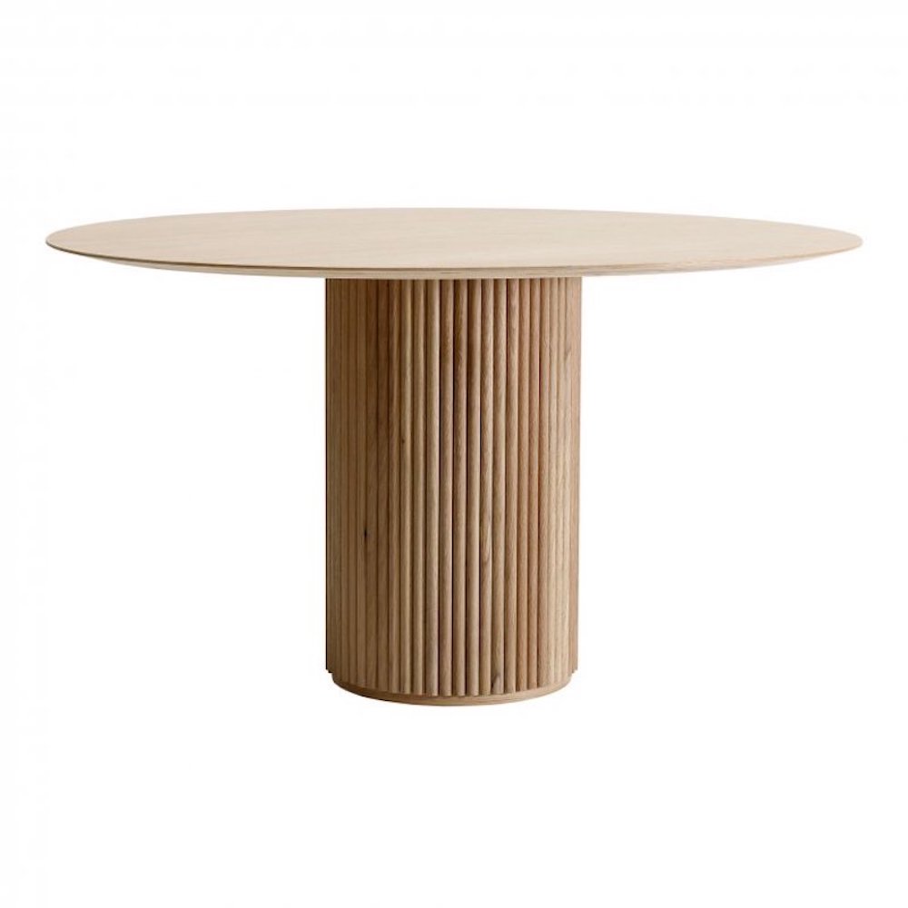 Bordet består av en fot av massiva ekpaneler antingen vitoljat eller i naturell ek och bordsskivan kan fås i ekfanér.