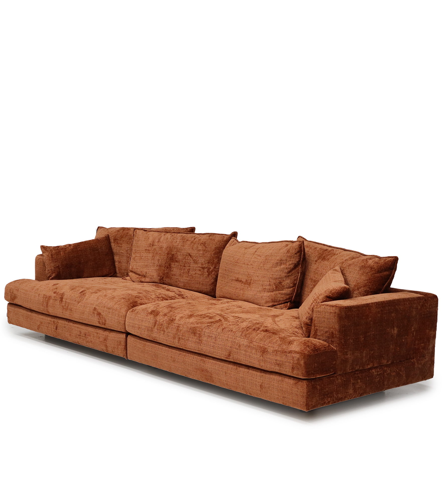 SCARLETT 4-sitssoffa är en imponerande loungemöbel som kombinerar exklusiv komfort med modern design. Med sitt generösa mått på 324 cm i bredd och ett djup på 120 cm skapar den en inbjudande plats för både vila och social samvaro. Soffans låga, svävande konstruktion och rundade former ger ett samtida uttryck, samtidigt som de dolda benen förstärker den stilrena silhuetten.