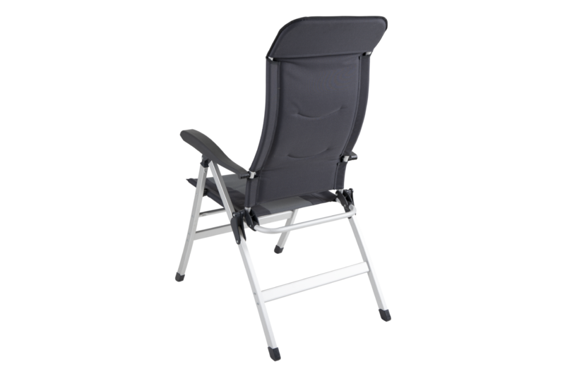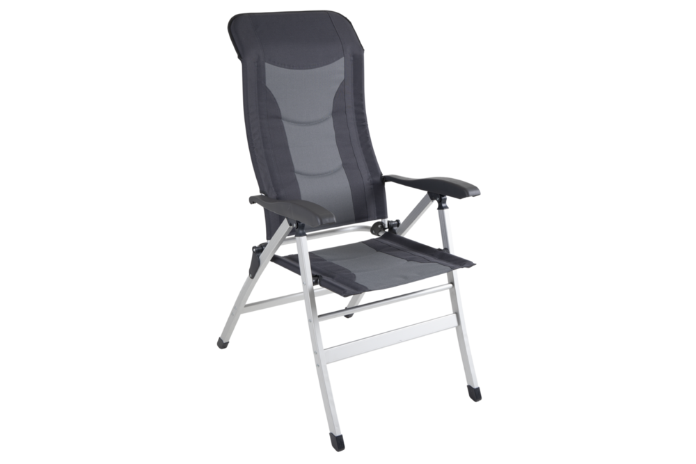 Praktisk, fällbar campingstol i aluminium med skön sits i textilene. Breda och bekväma armstöd i plast.